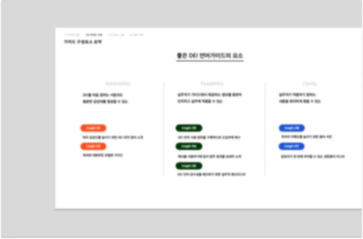 DEI 언어 가이드 리서치 프로젝트는 이러한 가치를 제품과 서비스에 반영하고 바람직한 언어로 사용자와 소통하기 위해 진행되었습니다. 언어 가이드는 마케팅, 광고, 제품 설명 등 기업에서 일관된 메시지를 전달하고자 하는 툴이라고 볼 수 있는데요. 우리는 고객사에서 제작한 기존 DEI 언어 가이드를 발전시키기 위해 사용자들에게 각광받는 글로벌 선도기업과, 학술기관, 공공기관의 자료를 비교 분석하였고 국내외 전문가 정성조사도 진행하였습니다. 이를 통해 가이드를 주로 활용하게 될 사내 임직원들의 관점에서 가장 유용하게 사용할 수 있는 가이드로 발전 방향을 도출하는 것이 핵심 목표였습니다.