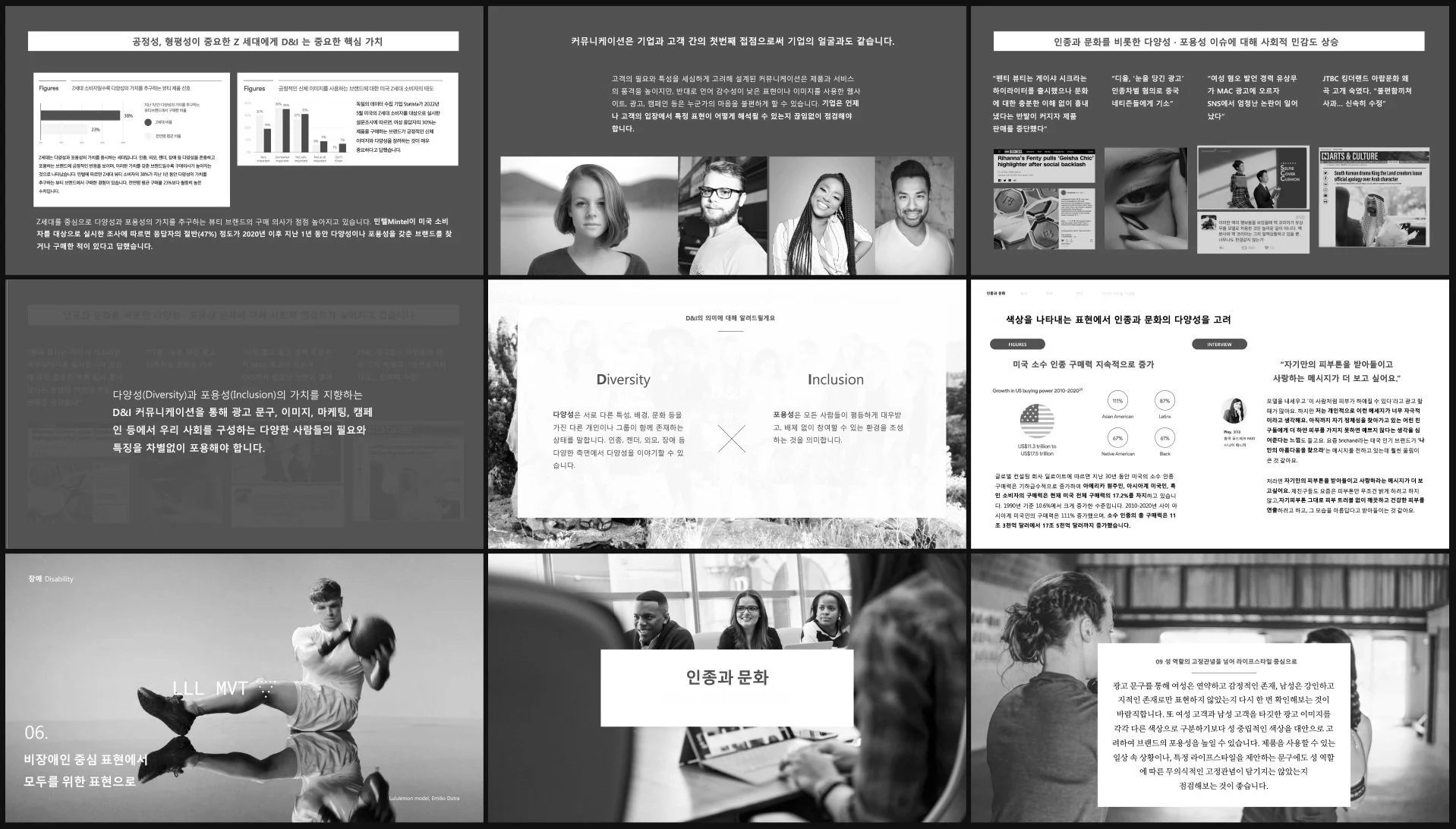 본 프로젝트의 목표는 그룹의 주요 계열사 브랜드의 제품 라인업을 다양성, 공평성, 포용성(DEI)의 관점에서 심도깊게 분석하고, 이에 대한 개선점을 도출하는 것이었습니다. 이를 위해 해당 브랜드들이 온라인 플랫폼에서 전개하는 모든 커뮤니케이션을 심층적으로 조사하였습니다. 특히, 장애인과 외국인을 포함한 사회의 다양한 구성원들의 의견을 수렴하여 이들의 시각을 반영한 인사이트 자료를 만들었습니다. 또한, 유사 영역의 글로벌 트렌드와 가이드라인을 참고하여, 우리 브랜드가 나아가야 할 최종적인 방향성을 제안하였습니다.